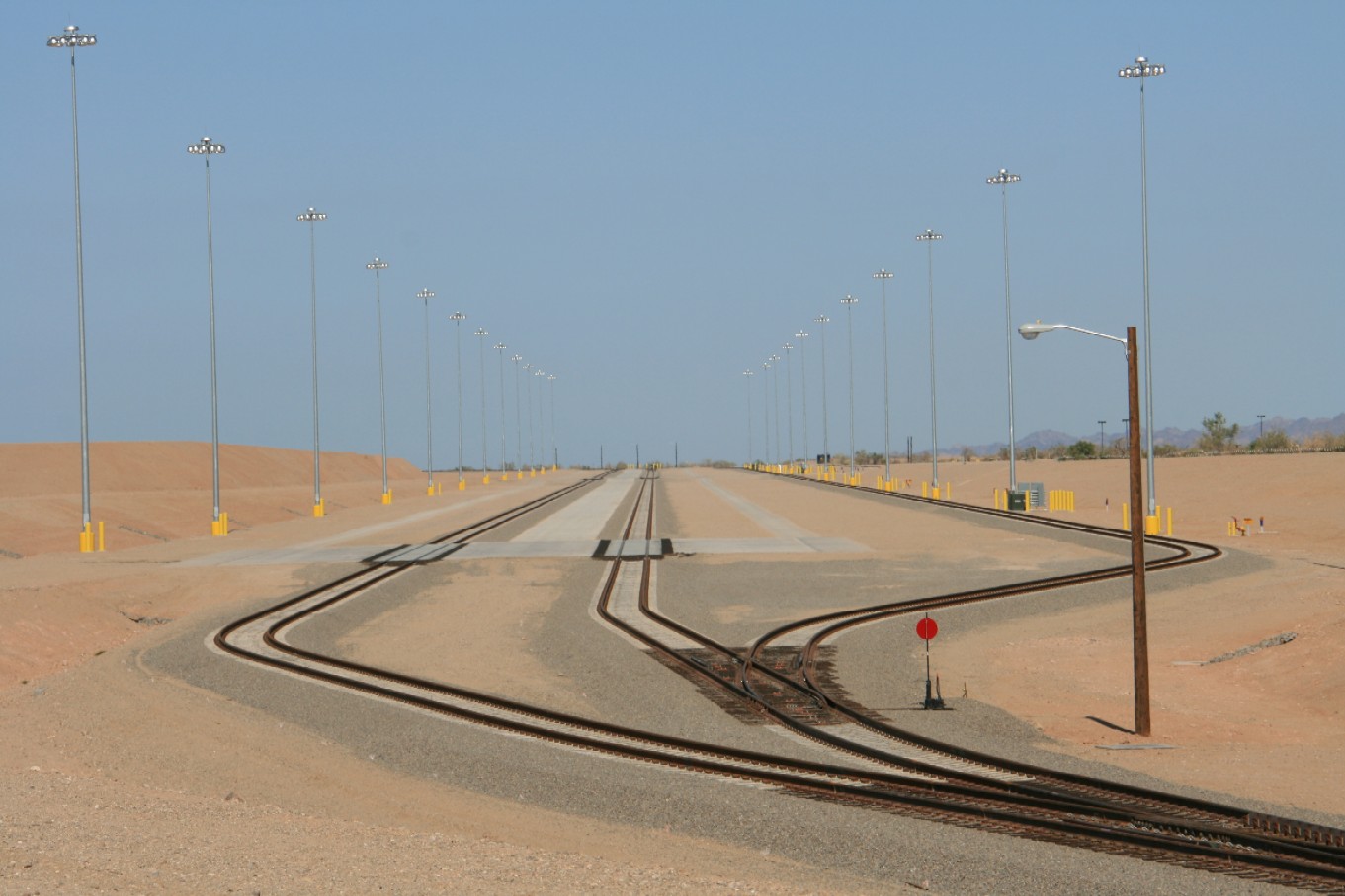 September 2010 Three desert road crossings are constructed along the rail spur between the mainline and the landfill to provide continued access to the desert north of the tracks .